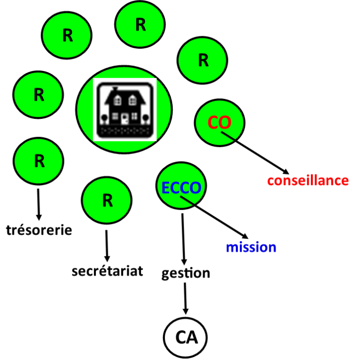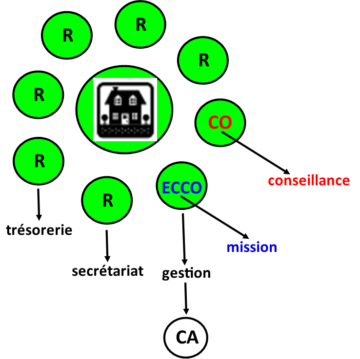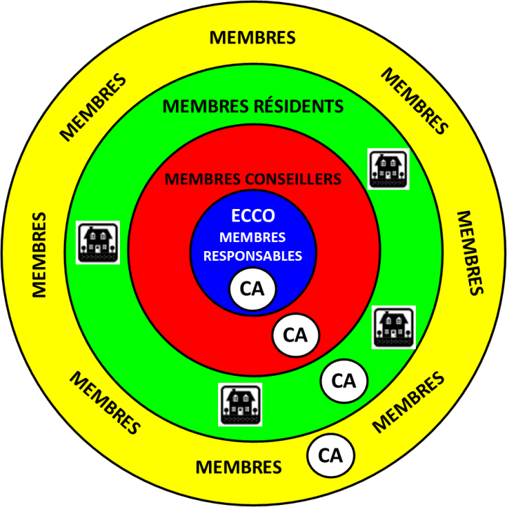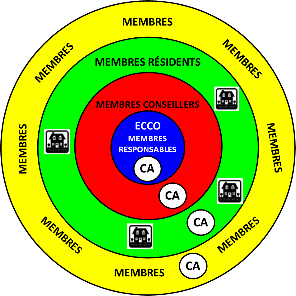 Chaque résidence possède une autonomie interne (présidence, trésorerie, secrétariat) avec son projet particulier (travail autonome, repos santé, accueil, ferme bio, etc.) reliée à la mission générale (ECCO) et accompagnée par un membre conseiller (vivre-ensemble).
