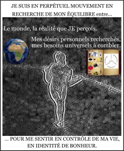 Je suis en perpétuel mouvement en recherche de mon équilibre entre… le monde, la réalité que je perçois et mes désirs personnels recherchés, mes besoins universels à combler… pour me sentir en contrôle de ma vie, en identité de bonheur.